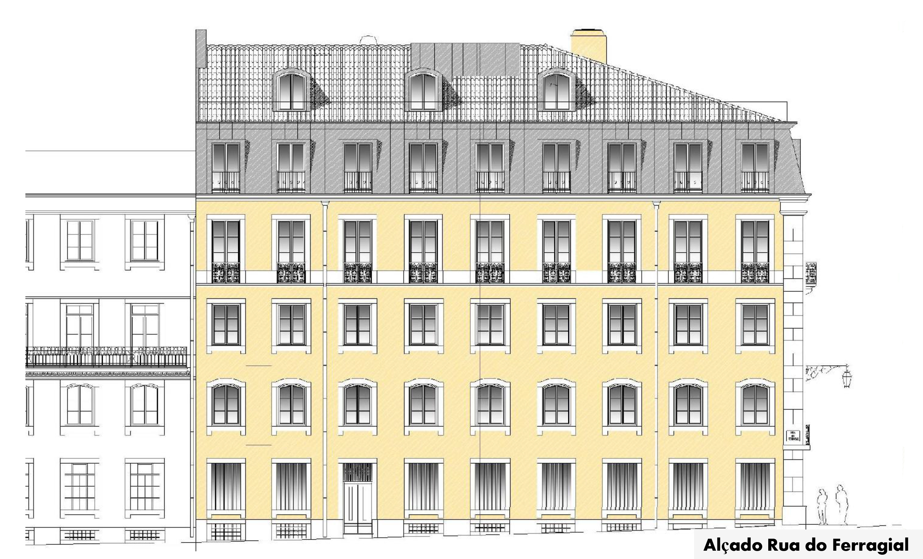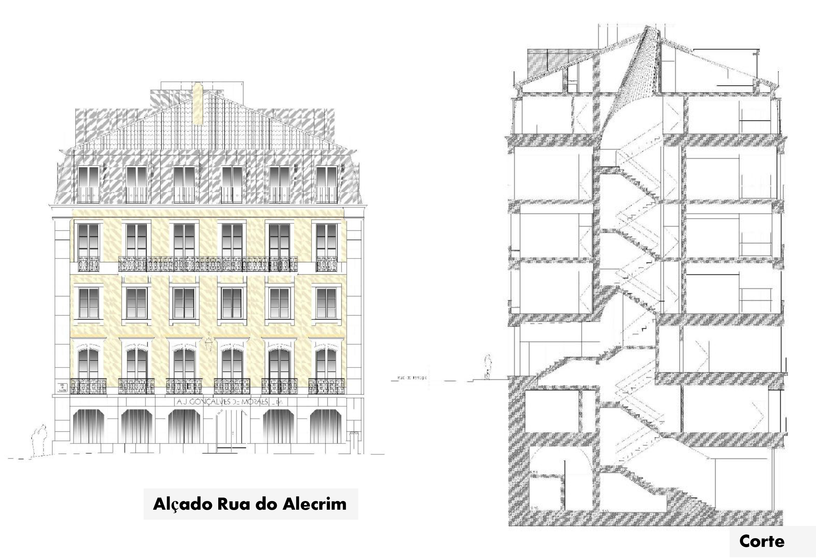 This is a post-Pombalina structure building, consisting of ground floor and 6 floors with fronts for Alecrim Street, Ferragial Street and São Paulo street.